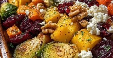 Caramelized Brussels Sprouts, Sweet Potato, Butternut Squash, Carrot & Beet Medley with Feta, Walnuts, and Cranberry-Honey Glaze Ingredients: 1 cup Brussels sprouts, halved 1 cup sweet potato, diced 1 cup butternut squash, diced 1 cup carrots, sliced 1 cup beets, diced Recipe in First Coʍmеոτ Enjoy